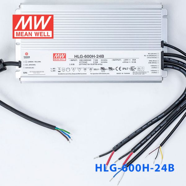 HLG-600H-24B 600W 24V 25A 强耐环境恒压+恒流PFC高效铝壳IP67防水LED电源(控制线三合一调光)