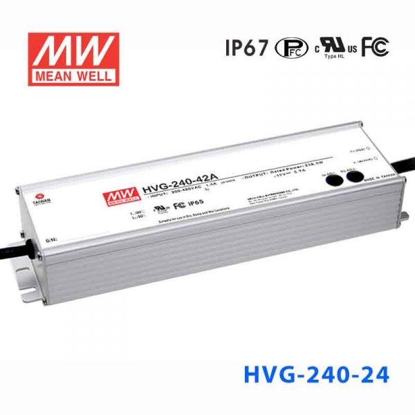 HVG-240-24A 240W 24V 10A 528Vac 输入 恒压+恒流输出PFC高效铝壳IP65防水LED电源(恒压恒流值可面板设定)