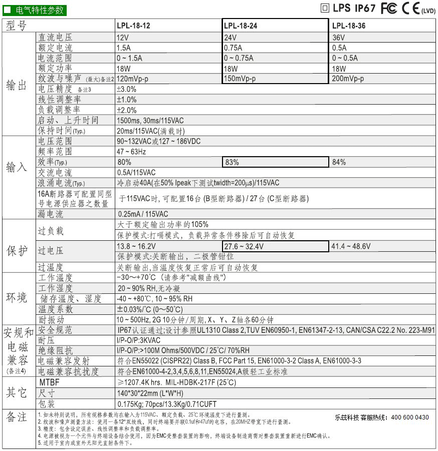 • LPL-18-24   18W   110V输入  24V   7.5A明纬牌恒压输出IP67防水塑壳LED电源