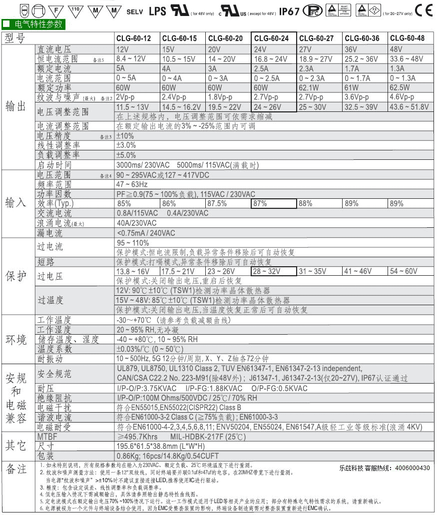 CLG系列产品属于有单级(60瓦)双级功率因素校正功能ED照明防水电源,恒压+恒流工作方式,铝壳灌胶封装IP65/IP67防护等级,4KV耐突波等级,100瓦以下机型通过Class 2限功率测试,具有包括过热保护等完善的保护措施。输出电压和电流可设置,全球范围输入电压,最高可达295Vac, 具有60瓦、100瓦和150瓦三种机型,输出电压分12V, 15V, 20V, 24V, 27V( 30V),36V, 42V, 48V七档。注意:150瓦机型分基本型、电压电流可设定型(A型)、调光型(B型)和适合于工控应用的端子台接线方式(C型)。适合LED路灯等室内外LED应用及工控应用。