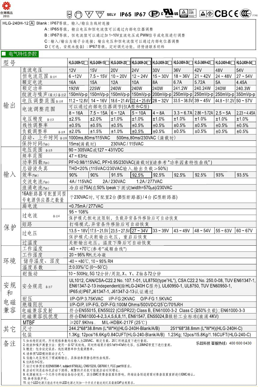 HLG系列产品属于有双级功率因素校正功能LED照明防水电源, 恒压+恒流工作方式,铝壳灌胶封装IP65/IP67防护等级,4KV耐突波等级,100瓦及以下机型通过Class 2限功率测试,具有包括过热保护等完善的保护措施。耐5G震动,-40℃启动,输出电压和电流可设置,全球范围输入电压,最高可达305Vac, 具有40, 60, 80, 100, 120, 150, 185, 240, 320瓦功率等级,输出电压分12V, 15V, 20V, 24V, 30V, 36V, 42V, 48V, 54V九档。注意:机型分基本型、电压电流可设定型(A型)、调光型(B型)和定时调光的D型和通过UL8750 listed认证的BL型(仅85瓦机型),100瓦及以上功率机型还可选通过CQC认证的机型。240瓦,320瓦还有端子台接线的C型机型,适用于各种LED路灯工矿灯等室内外LED应用及工控应用工程。