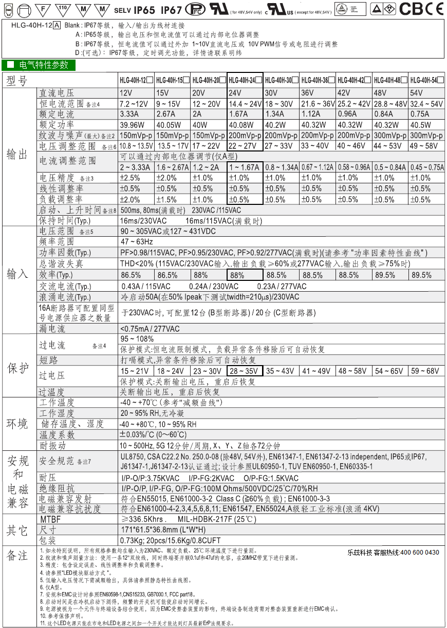 HLG系列产品属于有双级功率因素校正功能LED照明防水电源, 恒压+恒流工作方式,铝壳灌胶封装IP65/IP67防护等级,4KV耐突波等级,100瓦及以下机型通过Class 2限功率测试,具有包括过热保护等完善的保护措施。耐5G震动,-40℃启动,输出电压和电流可设置,全球范围输入电压,最高可达305Vac, 具有40, 60, 80, 100, 120, 150, 185, 240, 320瓦功率等级,输出电压分12V, 15V, 20V, 24V, 30V, 36V, 42V, 48V, 54V九档。注意:机型分基本型、电压电流可设定型(A型)、调光型(B型)和定时调光的D型和通过UL8750 listed认证的BL型(仅85瓦机型),100瓦及以上功率机型还可选通过CQC认证的机型。240瓦,320瓦还有端子台接线的C型机型,适用于各种LED路灯工矿灯隧道灯等室内外LED应用及工控应用工程。