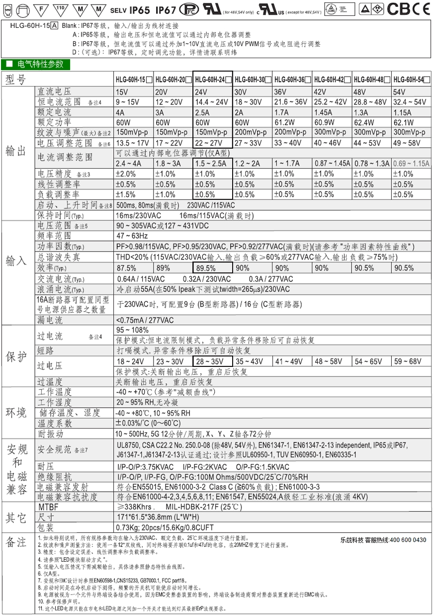 HLG系列产品属于有双级功率因素校正功能LED照明防水电源, 恒压+恒流工作方式,铝壳灌胶封装IP65/IP67防护等级,4KV耐突波等级,100瓦及以下机型通过Class 2限功率测试,具有包括过热保护等完善的保护措施。耐5G震动,-40℃启动,输出电压和电流可设置,全球范围输入电压,最高可达305Vac, 具有40, 60, 80, 100, 120, 150, 185, 240, 320瓦功率等级,输出电压分12V, 15V, 20V, 24V, 30V, 36V, 42V, 48V, 54V九档。注意:机型分基本型、电压电流可设定型(A型)、调光型(B型)和定时调光的D型和通过UL8750 listed认证的BL型(仅85瓦机型),100瓦及以上功率机型还可选通过CQC认证的机型。240瓦,320瓦还有端子台接线的C型机型,适用于各种LED路灯工矿灯等室内外LED应用及工控应用工程。