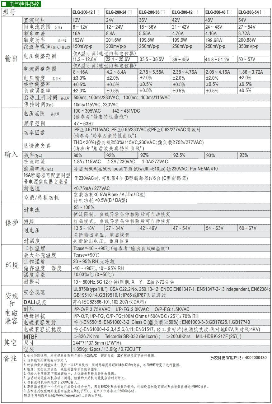 ELG-200-24 200W 24V 8.4A 基本型(线缆接线/铝壳IP67/100~305Vac输入)明纬PFC防水LED电源_明纬